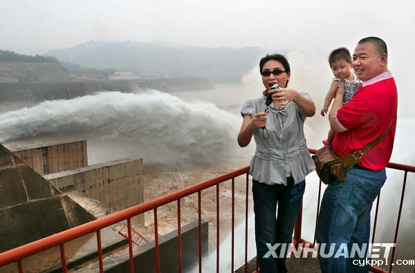 6月19日,在黄河小浪底大坝出水口顶部,来此游览的一家三口准备拍照留念。新华社记者 王颂摄