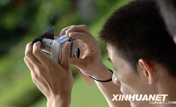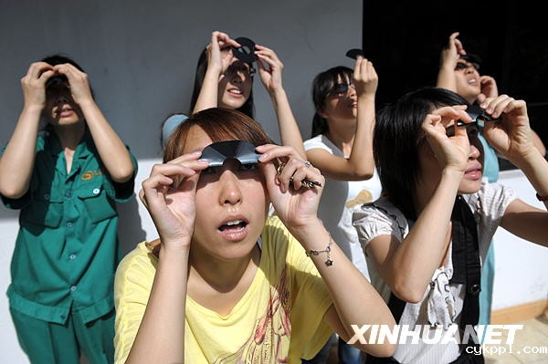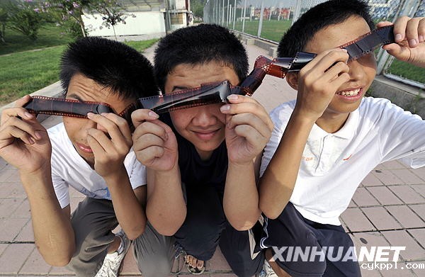7月22日,三位中学生在济南体育中心用胶卷观看日食奇观。