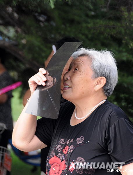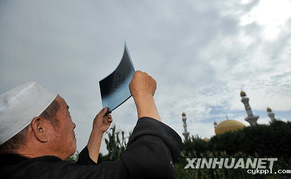 7月22日,在石家庄市石门公园,一位老人用X光片观看日食。新华社记者 王民 摄