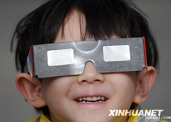 7月22日,一名小男孩在昆明东风广场上观看日食奇观。新华社记者蔺以光摄