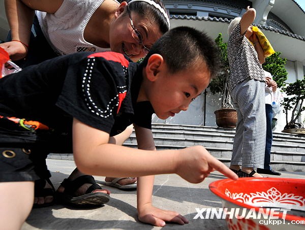 7月22日,在太原市儿童公园,一位小朋友通过水盆倒影观看日食新华社发(孟晨光摄)