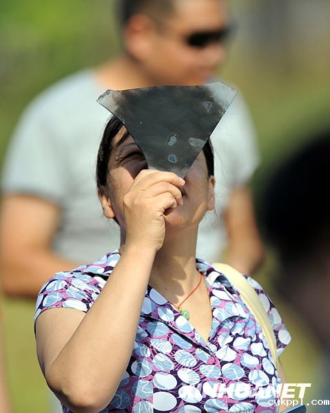 7月22日,一名九江市民透过熏黑的玻璃观看日食奇观。新华社记者章武摄