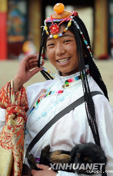香格里拉藏族姑娘卓玛抱着一只小藏獒露出灿烂的笑容(2008年10月11日摄)。 新华社记者蔺以光摄