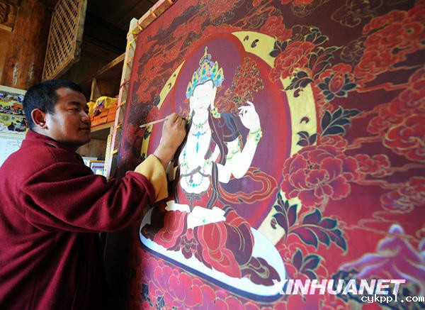 香格里拉县唐卡艺人洛桑克主在创作唐卡(2008年10月11日摄)。 新华社记者蔺以光摄
