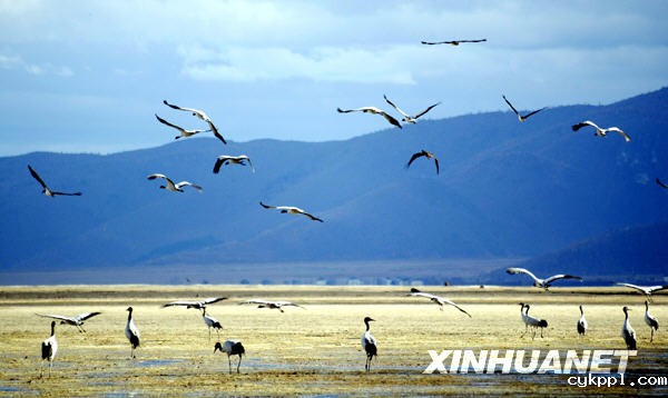 黑颈鹤在香格里拉县纳帕海自然保护区栖息(2006年11月6日摄)。新华社记者秦晴摄