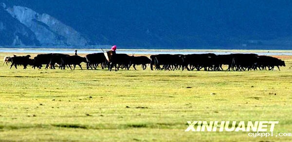 在香格里拉县纳帕草原上,牧民赶着牦牛回家(2006年9月28日摄)。新华社记者秦晴摄