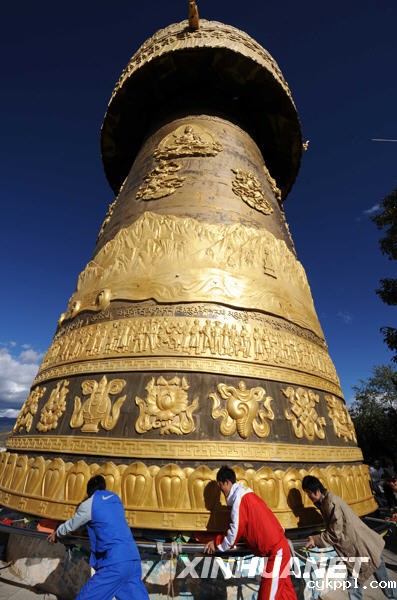 游客在香格里拉县建塘镇独克宗古城推巨型转经筒(2008年10月10日摄)。 这个巨型转经筒高21米,总重60吨,需要4个人一起推才能转得动。新华社记者蔺以光摄