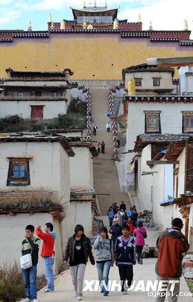 游客在香格里拉松赞林寺游览(2008年10月11日摄)。 新华社记者蔺以光摄