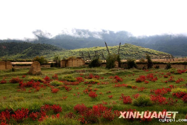 狼毒花盛开的香格里拉草甸牧场(2007年9月摄)。新华社记者陈海宁摄
