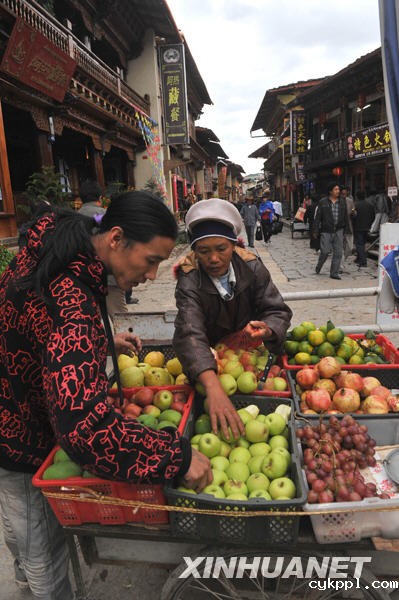 香格里拉建塘镇独克宗古城的水果摊(2009年8月20日摄)。新华社记者陈海宁摄