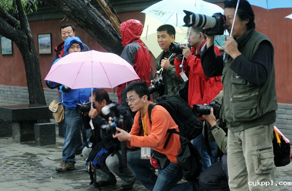 参加新闻摄影名家聚焦“中国古都——大同”的记者冒雨拍摄大同市新复建的文化旅游景点。