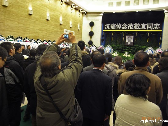 参加范敬宜先生的遗体告别仪式的群众展示范敬宜先生的生平照片。