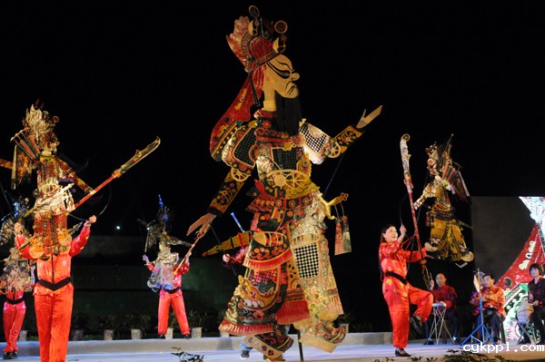 18、《我在阆中等你》文艺晚会剧照——皮影表演《桃园三结义》。王皮影又是一项在当地流传甚久的文化现象,现在又发展成皮影表演。阆中市文化和旅游局以文艺的形式演绎当地悠久的文明史,精心排练一台以反映当地各个历史时期文化文艺晚会,为前来旅游的各地客人演出。