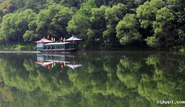 22、游船在构溪河国家级湿地保护区水面上行进,仿佛在绿树中穿行。