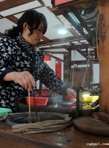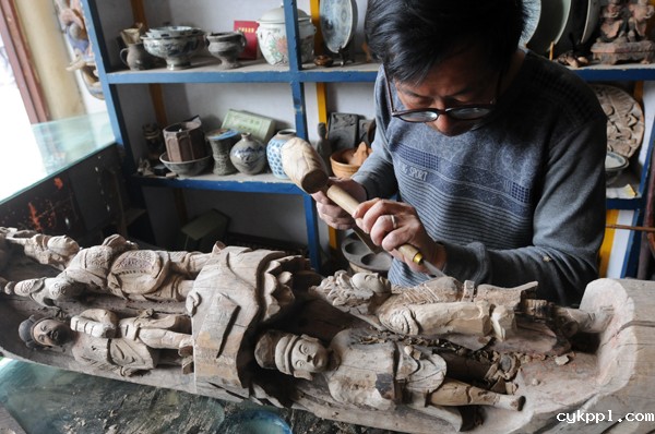 12、雕刻工艺师在古城门店里精雕细刻加工木雕。