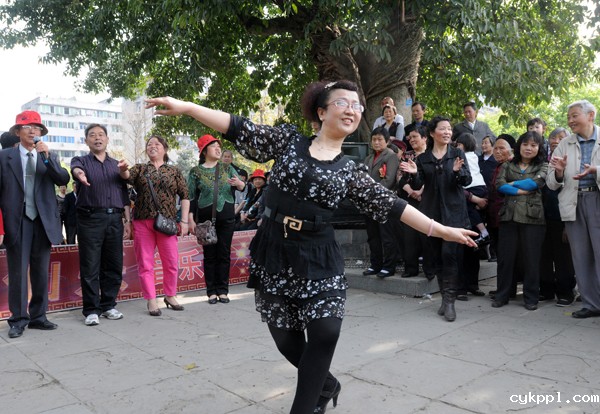 14、一位游客在参观阆中古城中高兴地跳起了舞蹈。当地老年民乐队义务为来古城旅游的各地游客唱歌跳伴奏。