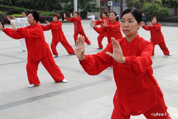 15、清晨,居住在古城的百姓在练太极拳,强身健体。