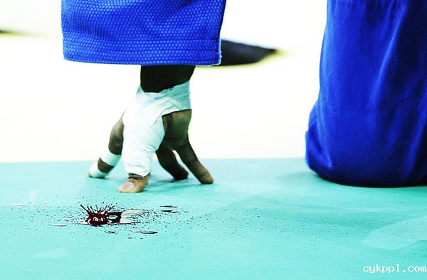 2008年8月11日,北京,海地柔道选手在奥运会女子57公斤级柔道比赛中头部受伤,血染赛场。