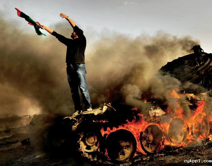 艾季达比耶被攻陷后,我迅速赶往当地。起义军占领了那儿,群众开始狂欢,朝天鸣枪。卡扎菲拥护者的尸体遍地都是,随着日头见猛散发出腐败的异味。坦克上燃烧着熊熊大火,我很担心它随时会发生爆炸。突然有一个人跳上了这辆正在燃烧的坦克。我对坦克没有兴趣,但这个人吸引了我。我希望表现出每个人重获新生时的那种喜悦感,而一幅恰好吻合的画面就这样突然出现在我的面前。我尽可能靠近,离坦克只有几米距离,开始狂拍一气。脑中默数到五,立马转身就走。我见到了太多四分五裂的尸体,而我并不想变成那个样子。我来这儿是为了讲述故事,我必须这么做,这是我前往此地的原因,但我并不能让自己太过贪婪。