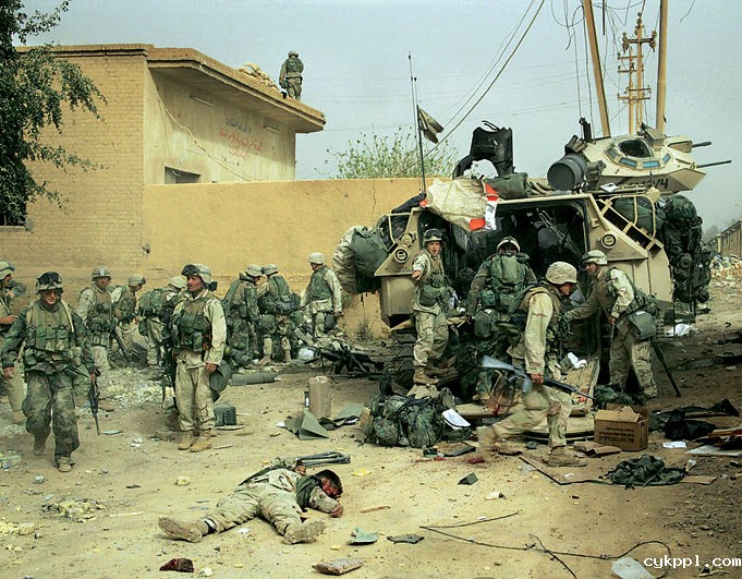 这张照片拍摄于军事行动开始。我们位于迪亚拉桥头,海军陆战队员们必须拿下这个据点才能继续进军巴格达。画面中看到的是先头部队,正是他们拉倒了萨达姆雕像。伊方向我们展开了猛烈的炮火攻击。一波接着一波的开火令人恐慌,这不光因为炮火本身,还因为炮火袭来的场面。有一枚炮弹正中坦克,如果这枚炮弹越过坦克那么一点点,被击中的可能就是我。本能让你想躲起来,但你不能这样做。你去那儿是为了工作,去那儿是为了传递新闻。只要动起来,就能克服恐惧。和平民及士兵们的压力比起来,我的算不了什么。我一直在对自己重复这一点。我来或者不来,他们都别无选择。