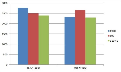 为了方便对比,我们选取了三台相机的最佳锐度光圈下的数值进行比较。尼康P300和佳能S95的锐度相差不多,而且都比佳能IXUS 310 HS的锐度要高。