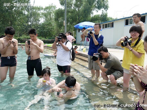 图为:拍摄渐入佳境,大家开始拿着手中的防水相机与泳池的水亲密接触