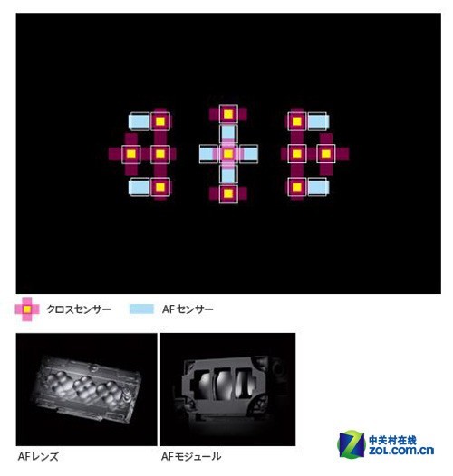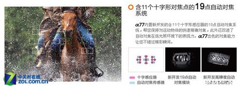 索尼在上一代产品(单电A55以及单反A580等)产品上实现了15点自动对焦。其中,对于对焦灵敏度至关重要的十字形对焦点设计了3个。而索尼这次在A77上设计的规格有了很大的提升,19点对焦系统包括了11个十字对焦点。