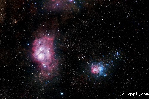 M20,也叫三叶星云或三裂星云,是发散和发射混和型星云,它的彩色照片非常美丽,可以看见它桃红色和亮蓝色的部分。用小型望远镜看,由遮掩物质形成的暗沟把这个星云分为三个区域,所以它被称为三叶星云。在星云的中心还有一颗耀眼的三合星HN 40。M20距地球约五千光年,同样位于人马座。
