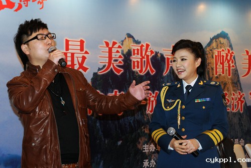 11月22日,青年歌手周鹏(左)、王莉在《华山传奇》音乐电视专集首发式上演唱歌曲《华山传奇》。当日,华山景区管委会在京举行《华山传奇》音乐电视专集首发式,著名词、曲作家张农科、孟庆云和一批青年歌手出席首发式并现场献歌。这部音乐电视专集以西岳华山文化为题材,由《华山之上》、《望华岳》、《三月三上华山》等五首歌曲组成,歌曲旋律优美、意韵悠久、大气恢弘,展示了华山的壮丽景色和精深文化。据了解,华山景区管委会正在着力打造文化带动旅游、促进经济发展的新品牌。王呈选摄影报道