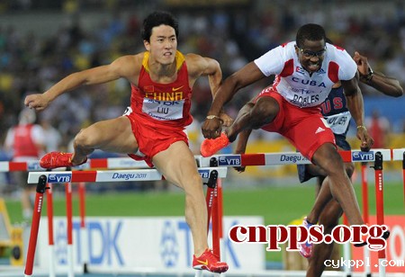 8月29日,中国选手刘翔(左)在决赛中遭遇古巴选手罗伯斯手臂拉拽。当日,在2011世界田径锦标赛男子110米栏决赛中,罗伯斯因犯规被取消成绩,丢掉到手的金牌,刘翔从铜牌晋升银牌。(第22届中国新闻奖摄影作品初评入围作品)