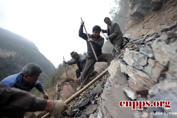 “愚公支书”王光国(右二)带领村民们开凿道路。