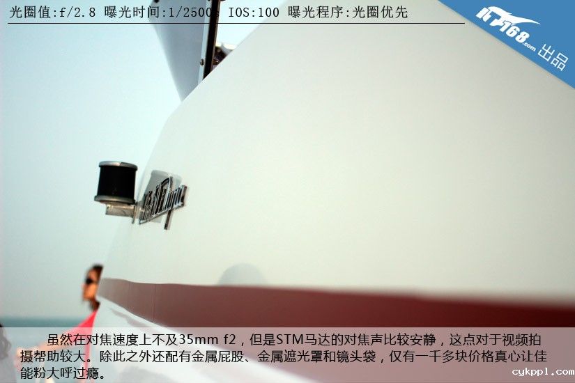 虽然在对焦速度上不及35mm f2,但是STM马达的对焦声比较安静,这点对于视频拍摄帮助较大。除此之外还配有金属屁股、金属遮光罩和镜头袋,仅有一千多块价格真心让佳能粉大呼过瘾。