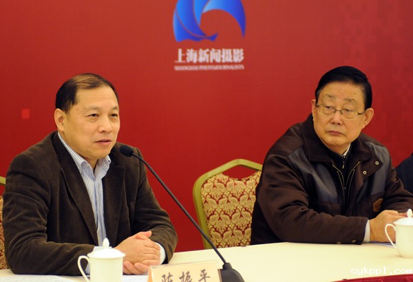 图为上海市新闻工作者协会第六届理事会新闻摄影工作委员会主任陈振平发表就职感言。