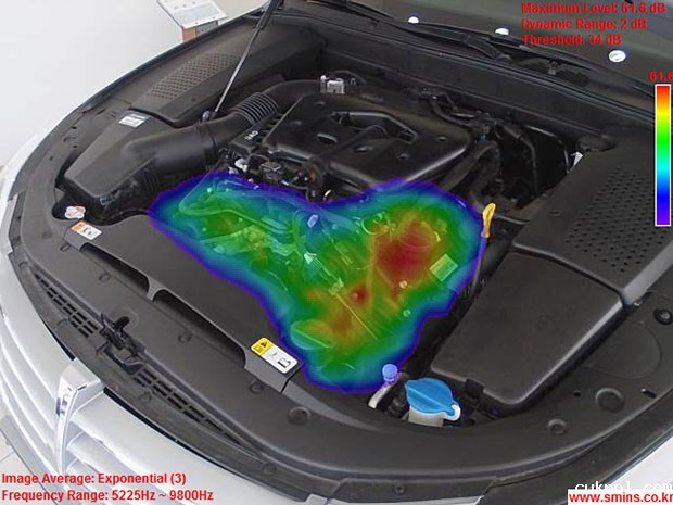 来自麦克风和相机的数据将叠加显示在其连接的计算机上——像热度计一样,以不同的颜色区分噪声的分布和强弱。