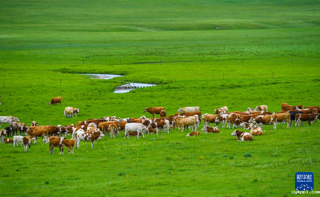 7月15日,牛群在内蒙古锡林郭勒盟东乌珠穆沁旗的草原上觅食。