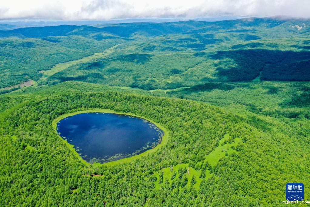 这是7月14日拍摄的内蒙古阿尔山国家森林公园内的天池(无人机照片)。