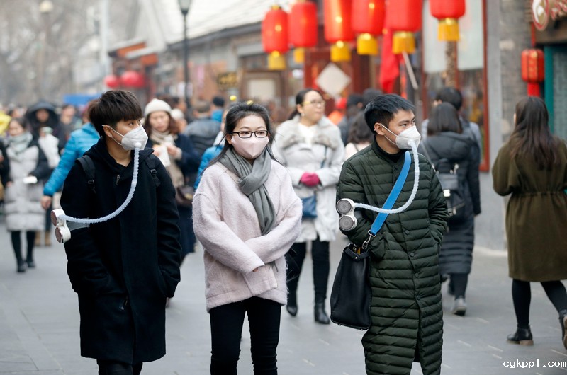 游客戴空气净化器口罩游览北京南锣鼓巷
